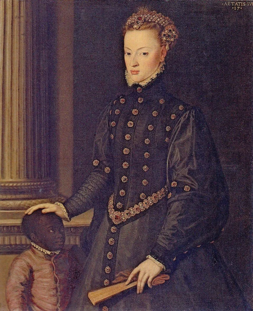 The first generation of Africans in Europe was mostly slaves, but many of their children were mixed-race or ‘mulattos’. Many of these children had opportunities to achieve higher social standing. Prominent European mixed-race figures minimized their blackness to integrate into society. Throughout Europe, laws on slavery differed. For a long time, slavery was not hereditary, so children of slaves could be free. As the nature of slavery changed, the status of a child was often determined by their father. If a child’s father was free, so was the child. (Blakely) Many second-generation African Europeans were mixed-race, so these were the children who had opportunities to gain social power. The Portrait of Maria Salviati de’ Medici and Giulia de’ Medici is a prime example. (Carucci) The Medici’s were one of the most powerful families in Renaissance Italy. (Britannica) Giulia is the daughter of Alessandro de’ Medici, the former duke of Florence. When he was assassinated, Giulia was placed in her aunt’s care. In the painting, we can see Giulia has African features, features that match portraits of her father, but her skin is painted a ghostly shade of white, matching Maria’s. The figures both look like they are carved from pale marble. Small Giulia clutches Maria’s hand, showing she is a part of Maria’s family, equal to any child of Maria’s. The painter minimized what would be Giulia’s most differentiating feature, darker skin. Painting her as white denoted her as a Medici, powerful and rich.