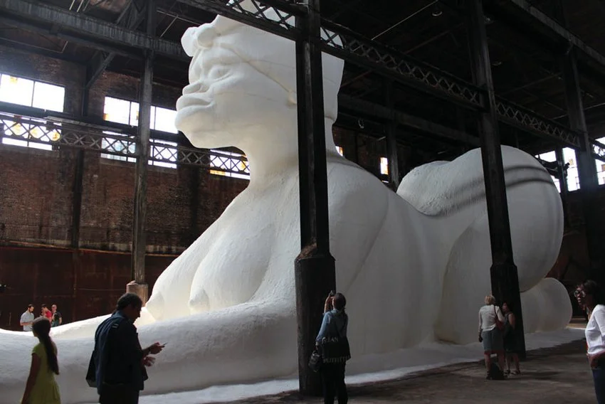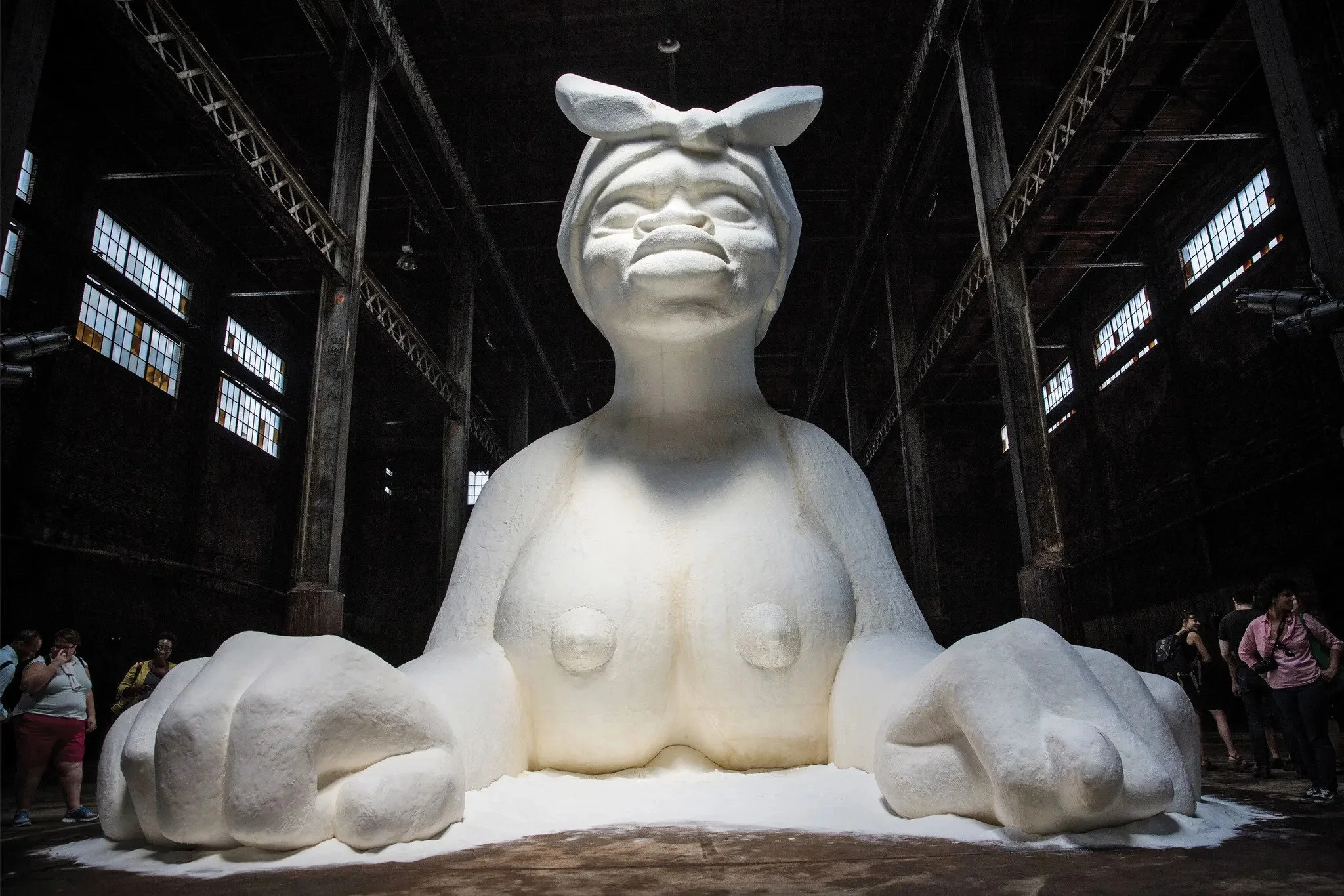 35 feet high and 75 feet long, Walker’s sugar sphinx looms over visitors in the decommissioned Domino Sugar Factory. With unmistakably Black features and a headscarf reminiscent of the ‘Mammy’ caricature, Walker’s sculpture explores the dark history of sugar processing and its abuse of Black bodies. Walker draws inspiration from the medieval delicacies, sugar subtleties, which were consumed at grand feasts in recognition of the hosts’ power and affluence. Prostrate and nude, the sphinx becomes an indulgence to be consumed by the eyes of her audience.