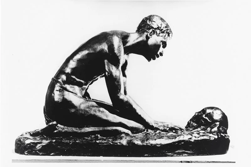 The central figure kneels in front of the skull, contemplating or perhaps conversing with it. Fuller contrasts his lithe figure with the lone skull. Both are stripped of their usual concealments: clothing and flesh respectively. The man’s imploring posture reflect the desire of many Harlem Renaissance artists to reconcile an ancestral African past lost through centuries of enslavement.