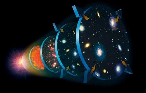 Figure 1: The Expansion of the Universe began with the Big Bang. Its expansion is still accelerating because of dark energy, although gravity (brown arrows) attempts to stop it [8].