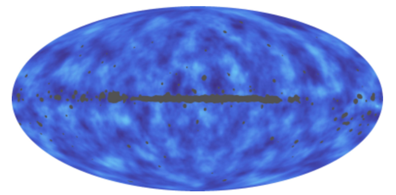 Figure 3: The Planck satellite’s 2015 CMB lensing potential data expressed as an all-sky map. The lighter regions correspond to over-densities and the darker regions show under-densities. The gray regions were masked in the analysis [12].